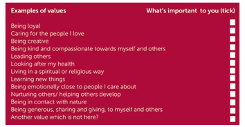 The box below provides some examples of values which you might find useful but feel free to come up with your own. Remember values are about what really matters to you. If cardiomyopathy is getting in the way of your goals, it is even more important to be clear about your values.
