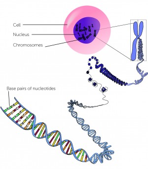 The chromosomes found in the nucleus of cells are made of a material called deoxyribonucleic acid or ‘DNA’. The DNA of each chromosome is made up of two vast strands of nucleotides, which pair up together and twist around each other in a structure called a double-helix. This structure is a way of getting a lot of information tightly packed into a very small space, and also protects it.