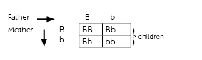 The children that inherit B from their father will have brown eyes (because they have a dominant allele). The children that inherit b from their father will have blue eyes (because they have a second ‘b’ from their mother, and so both allels are recessive). In this example, the children are equally likely to have brown eyes (Bb) as blue eyes (bb).